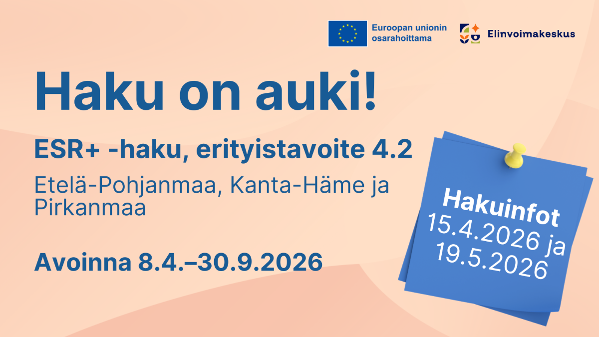 Keski-Suomen elinvoimakeskus on avannut Euroopan sosiaalirahasto plus (ESR+) -hankehaun Etelä-Pohjanmaan, Kanta-Hämeen ja Pirkanmaan maakunnissa. Haku on auki syyskuun loppuun saakka. Lisätietoa hausta on tarjolla hakuinfoissa ke 15.4. ja ti 19.5. sekä kyselytunneilla ma 27.4. ja ke 19.8 – ilmoittaudu mukaan!