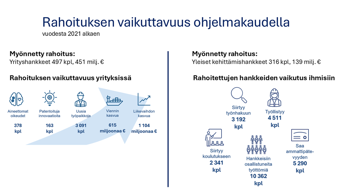 Hankkeet ovat myös parantaneet ihmisten työllistymistä, osaamista ja koulutusmahdollisuuksia. Hankkeisiin osallistuneet ovat siirtyneet työmarkkinoille, koulutukseen ja saaneet uusia ammattipätevyyksiä.