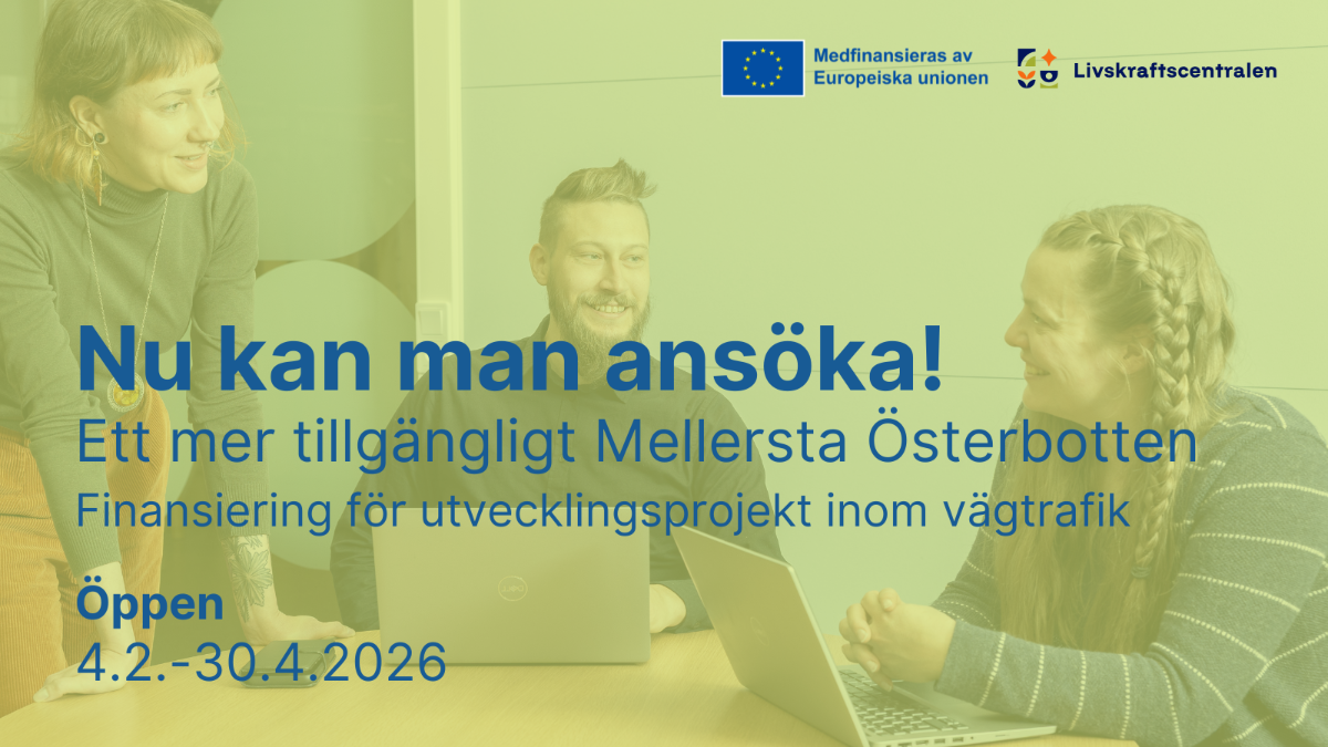 Vid livskraftscentralen i Mellersta Finland kan finansiering sökas för Mellersta Österbotten för investeringsprojekt inom vägtrafik samt gång- och cykeltrafik (lätt trafik) som främjar verksamhetsförutsättningarna för produktions-SME-företag och turistföretag, och utvecklingsprojekt. Ansökan är öppen till 30.4.2026, och det finns cirka 1,9miljoner euro att söka.