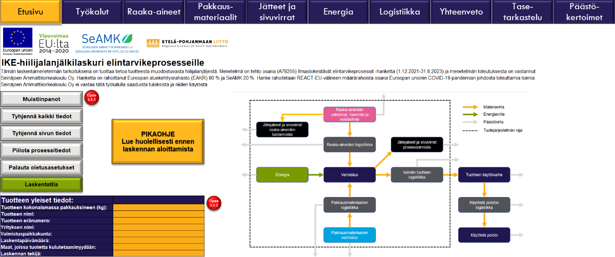 Seinäjoen Ammattikorkeakoulun Euroopan Aluekehitysrahaston (EAKR) rahoittamassa Ilmastokestävät elintarvikeprosessit -hankkeessa kehitettiin elintarvikeprosesseissa valmistettavien tuotteiden hiilijalanjäljen arviointiin erityisesti keskittyvä maksuton IKE-hiilijalanjälkilaskuri. Microsoft Excel-pohjaisen hiilijalanjälkilaskurin ja sen käytön tukena käytettävän laskentaohjeistuksen avulla myös mikro- ja pk-yritysten toimijat voivat itsenäisesti arvioida omien tuotteidensa hiilijalanjälkivaikutuksia. Laskenta-arvioinneista saatavia tuloksia ja hankkeessa laadittua Elintarvikealan pk-yritysten ympäristövaikutusten hallinnan opasta hyödyntämällä voidaan yrityksen elintarviketuotetta ja valmistusprosessia kehittää entistä kestävämmäksi ilmastonäkökulmasta.