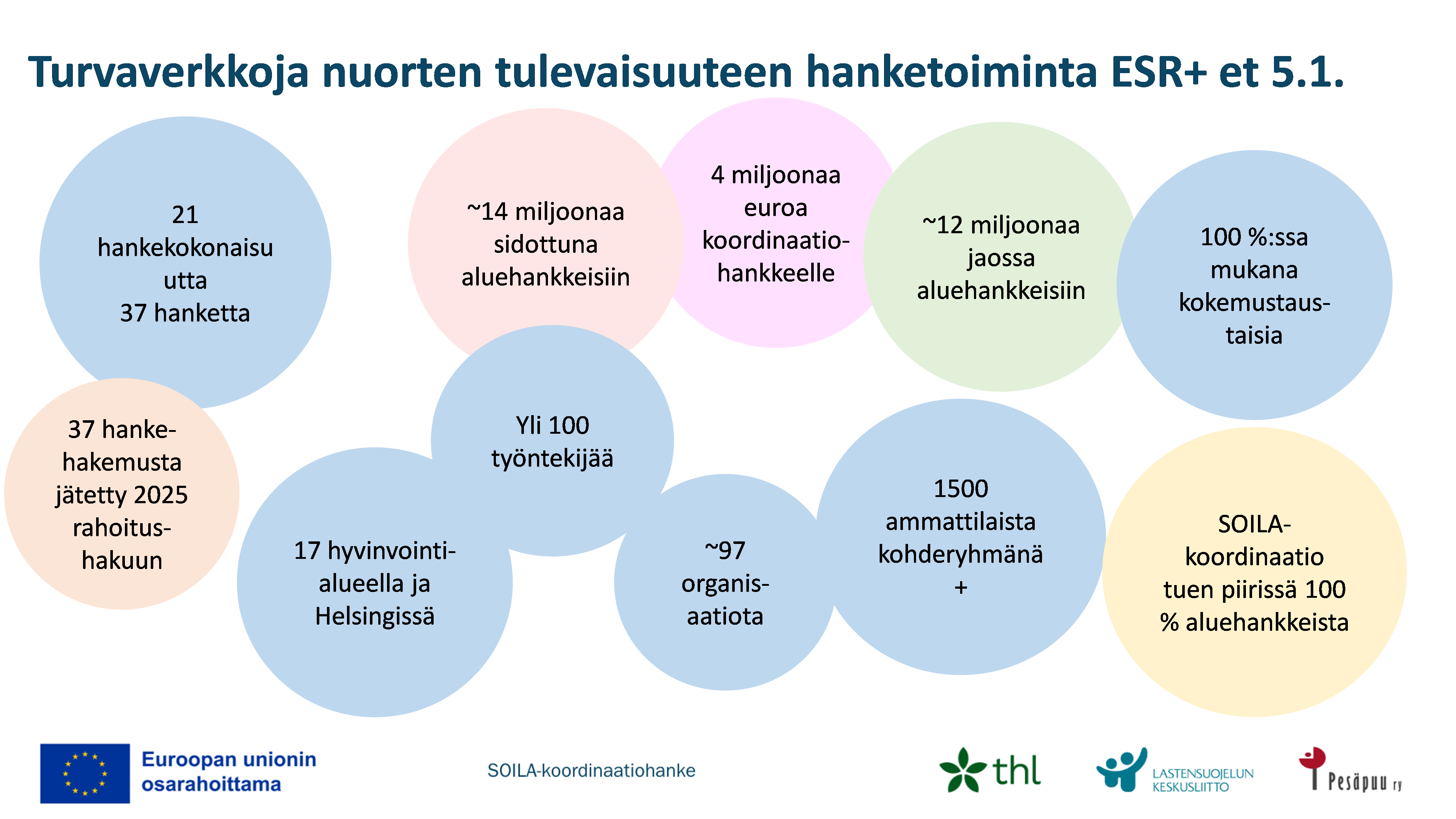 Turvaverkkoja nuorten tulevaisuuteen (ESR+ et. 5.1) -rahoitus jatkuu EU-komission leikkauspäätöksistä huolimatta alkuperäisen budjetin mukaisesti. Osaava ja Uudistuva Suomi -ohjelman pidentyessä aluehankkeet ja valtakunnallinen SOILA-koordinaatio mukautuvat muutoksiin. Lastensuojelua uudistetaan aluehankkeissa jo 21 kokonaisuuden ja 37 osahankkeen voimin 17 hyvinvointialueella ja Helsingissä. Rahoitusta aluehankkeisiin on sidottuna 14,4 miljoonaa euroa. Lisäksi syksyn 2025 rahoitushakuun jätettiin 37 hakemusta, jotka ovat parhaillaan rahoittajan arvioinnissa. Vuonna 2026 rahoitushaku avataan osassa maakunnista – pysy siis kuulolla!