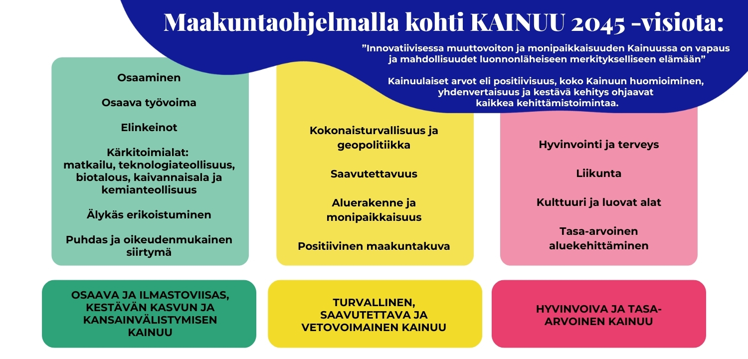 Lisätietoa Kainuun kehittämisen painopisteistä ja maakuntaohjelmasta löytyy Kainuun liiton verkkosivuilta